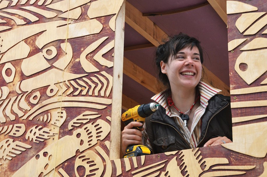 Emily du Houx, framed by her designed cabin walls, preparing the Michi Zeebee for the road trip to her launching in St. Paul.