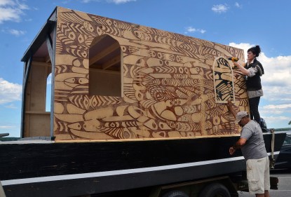 Emily du Houx and Daren, from the Apprenticeshop, preparing the Michi Zeebee for the road trip to her launching in St. Paul.But the Zeebee is more than a riverboat.