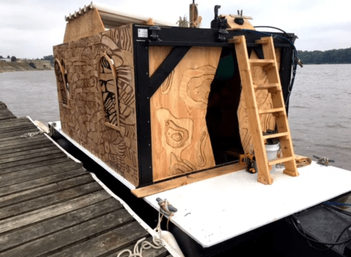 There are canvas walls that stretch over the fore and aft of the boat as doors. But one was ripped off in a violent storm. At a stop at the Convivium Urban Farmstead downstream from Dubuque, the two constructed a new door from plywood, using topographical maps as a template and they added a hydroponic garden on the roof. (photo above, read more about it HERE.)
