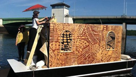 “The pattern will start out as a carved bevel, but as we travel the river and collect items along the way — shells, rocks, plastic bottles, and the like — we will fill the carved recesses, inlaying and coloring them with the detritus of the river,” said Emily. “On deck, in place of a traditional showboat’s stage, we will be rigging up a mechanism to create a screen from water pumped from the river. We intend to project sonar scans of the river bottom onto this water screen, bringing the rarely seen and volatile river bed to the surface for viewers on the banks.”