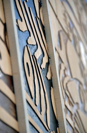 The wooden hull is covered by framed plywood, with windows cut out and images of flora and fauna from river life scrolled in. (photo right)