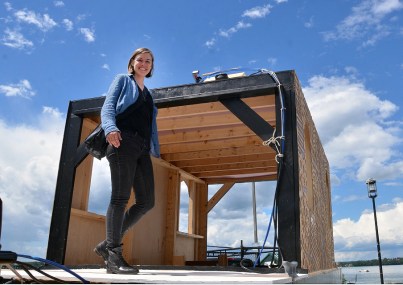 Morgan Rogers at the “road trip” launching in Portland, Maine on the Michi Zeebee’s deck showing the bare bones cabin that will be added to along the journey.
