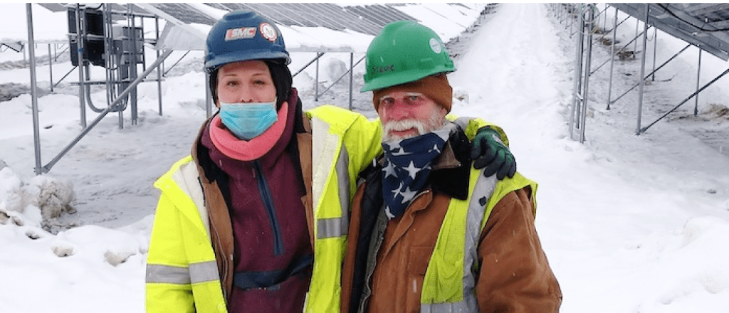An IBEW 567 apprentice electrician with a co-worker at a solar array site | Courtesy photo