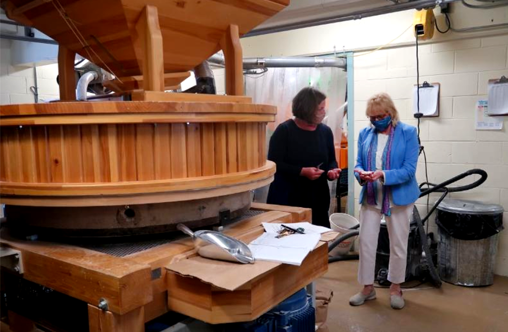 Amber Lambke, owner and visionary of Maine Graines shows Maine Governor Mills how the grist mill works.