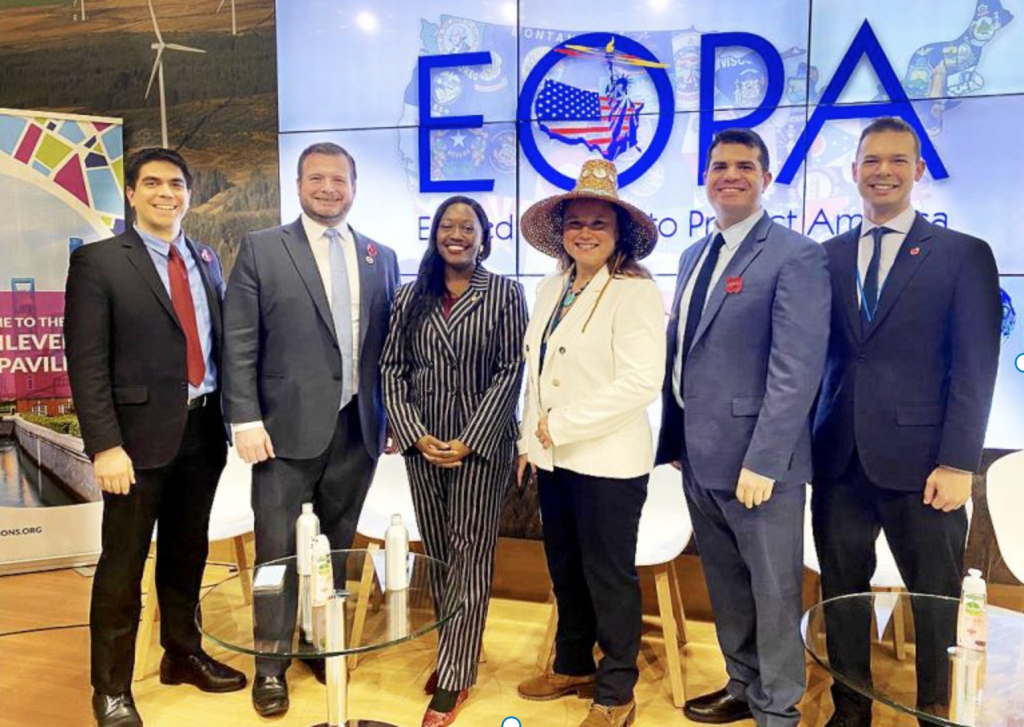 Dominic Frongillo, Executive Director and Co-Founder of Elected Officials to Protect America, Maryland Delegate Pat Young, Marine Veteran, Natalie Murdock, North Carolina State Senator,Fawn R. Sharp, the 23rd President of the National Congress of American Indians (NCAI), Vice President and past President, Quinault Nation, Taholah, Andy Katz, Director, East Bay Municipal Utility District, Oakland, California and EOPA Co-Founder and Alex Cornell du Houx, former Maine state Representative, Marine combat veteran, President of the Elected Officials to Protect America and Co-Founder after the press event at COP26.