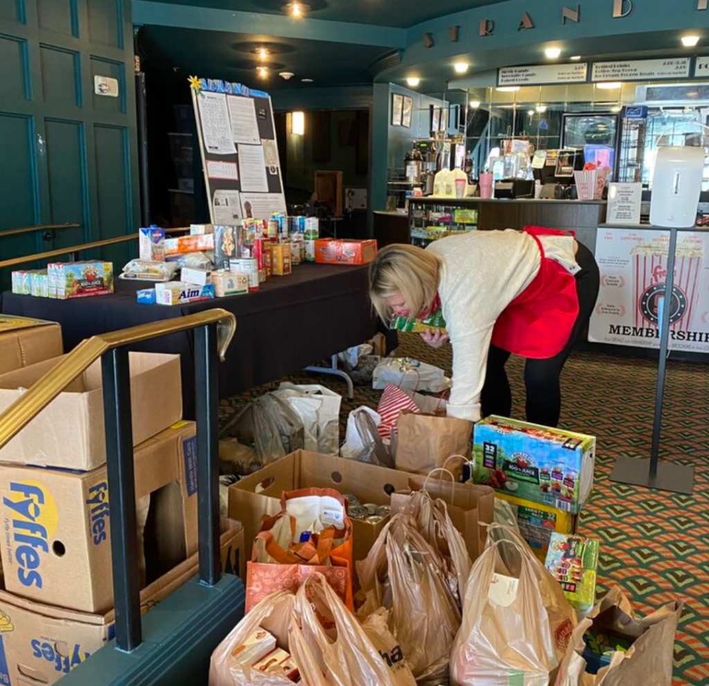 FILL THE STRAND workers and volunteers fill the theatre with food for those in need during the pandemic. Photos courtesy of Area Interfaith Outreach.